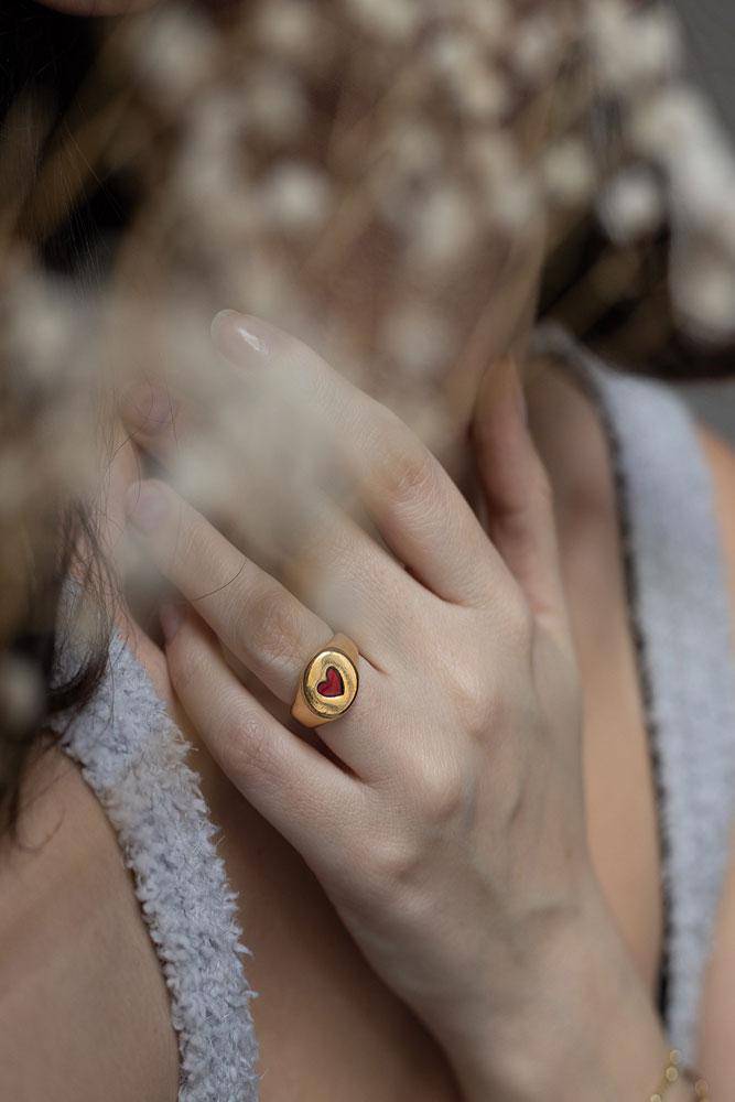 Επίχρυσο δαχτυλίδι με κόκκινη καρδιά. Το μέγεθος αυξομειώνει. Το μέταλλο είναι ορείχαλκος επίχρυσος 24Κ. Έρχεται σε premium κουτί φύλαξης.