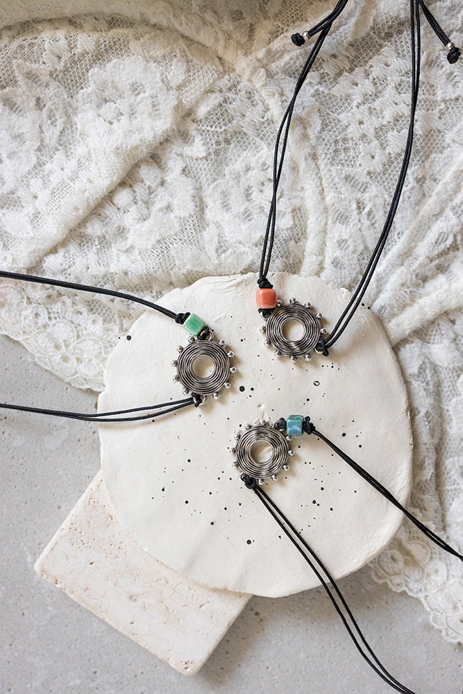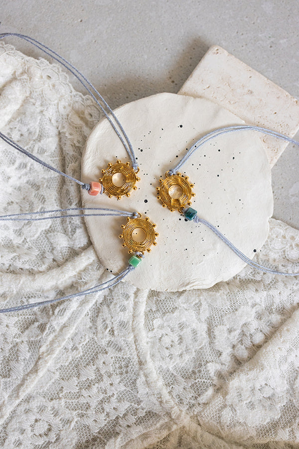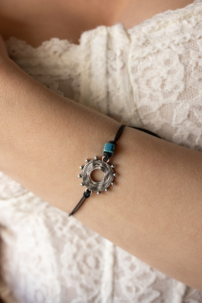 Χειροποίητο μακραμέ βραχιόλι με επίχρυσο ή επάργυρο στοιχείο ήλιος και κεραμικό κυβάκι. Το μέγεθος αυξομειώνεται για να ταιριάζει σε όλα τα μεγέθη. Έρχεται σε premium κουτί φύλαξης.